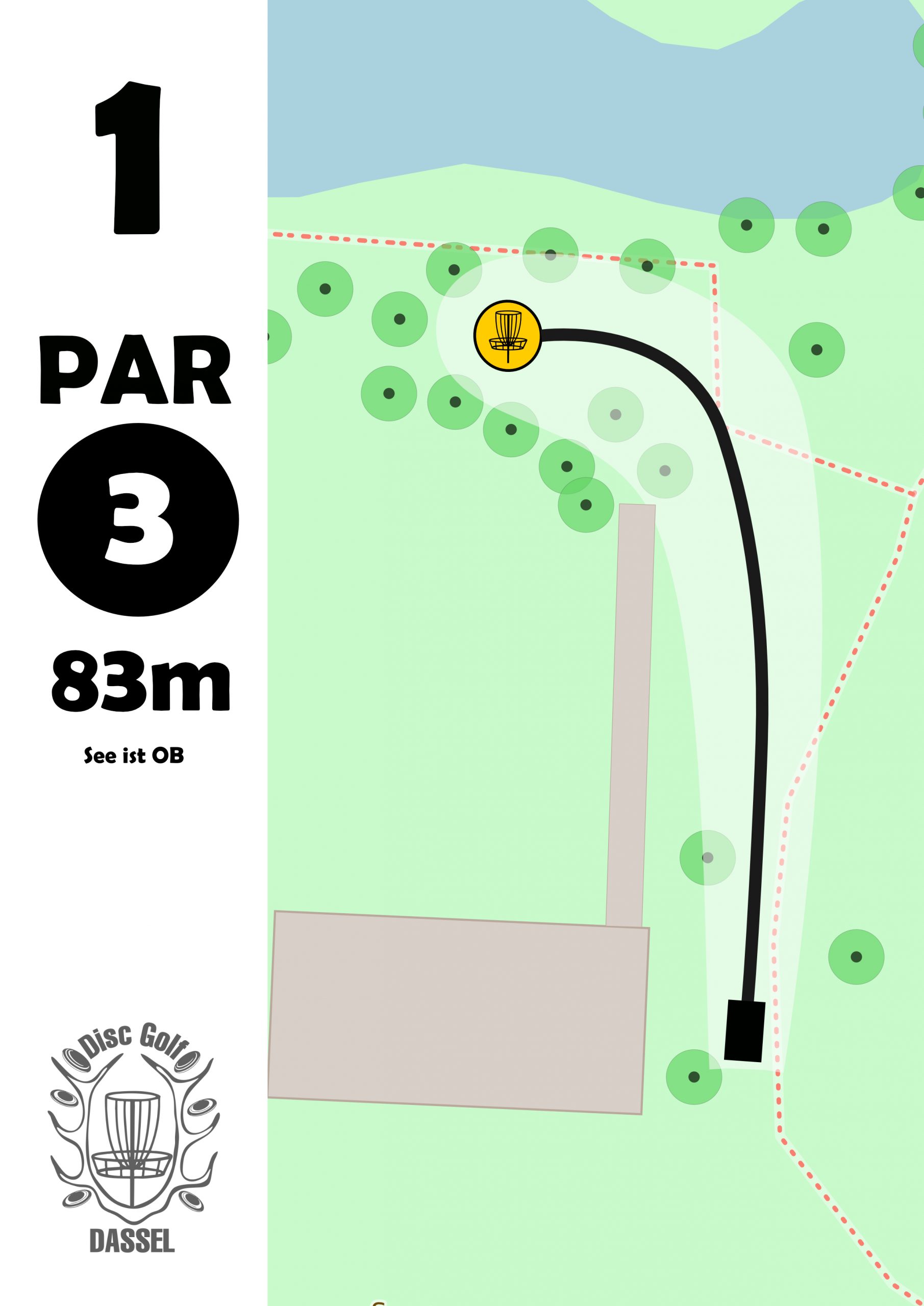 Bahn 1 startet am nördlichen Parkeingang. Der Korb befindet sich vom Abwurf aus gesehen links hinter der Mauer auf einer kleinen Erhöhung. Hinter den Bäumen, die geradeaus sichtbar sind befindet sich ein See. Das Wasser ist OB.